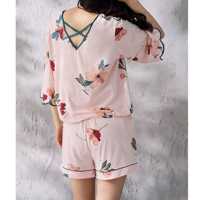 Vネックフラワープリント ショート丈プルオーバー&パンツ*L-513