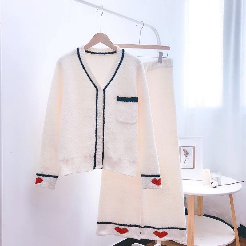 ポイントハートの女性らしさが目を惹くVネックカーディガンのロング丈こもこセットアップ☆⋆。*
