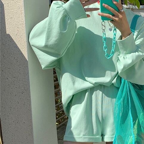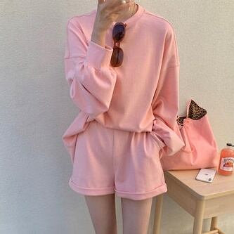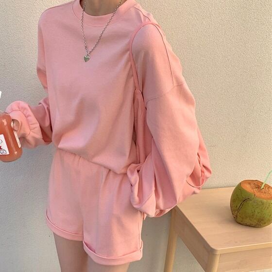 ゆったりとしたシルエットで着心地が良い、同素材のトレーナーとショートパンツのセットアップ☆⋆。*