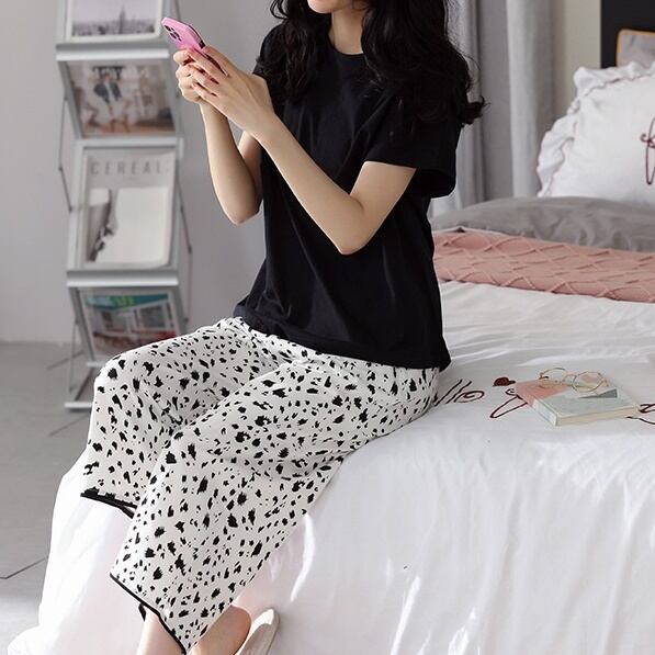 シンプルブラックTシャツにスプラッシュプリントのクロップドパンツがセットになったコットンルームウェアセットアップ☆⋆。*