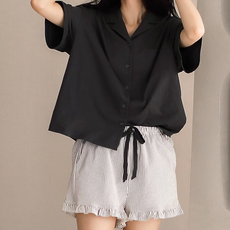 モノクロシャツ & フリルショートパンツ セットアップ*L-696