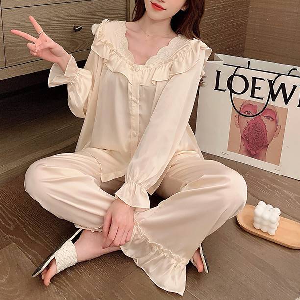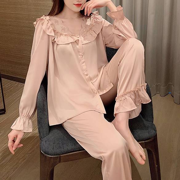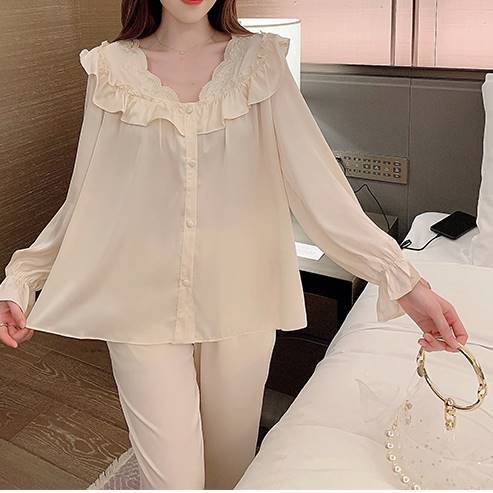 アイスシルク フリルカラーレディ ロング丈セットアップ ルームウェア*L-739